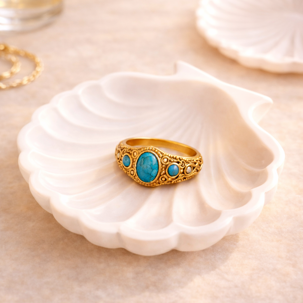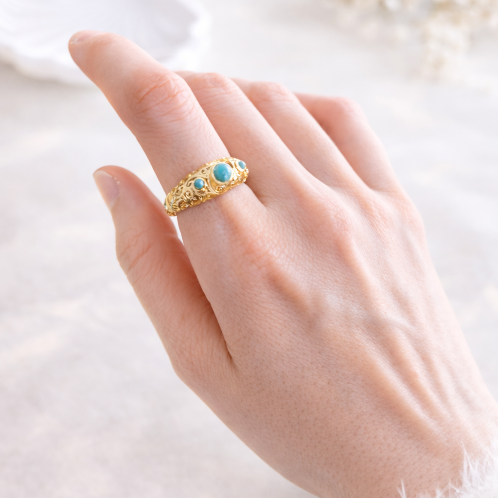 Turkuaz taş detaylı vintage yüzük, pirinç üzeri gold kaplama yapısıyla şık ve zamansız bir görünüm sunar. Günlük kullanım ve özel gün kombinleri için ideal olan bu zarif kadın yüzük, göz alıcı taş detayı ve el işçiliği dokusuyla öne çıkar. Lüks ama ulaşılabilir takı arayanlar için tasarlanan bu model, Eunshin koleksiyonunun en dikkat çeken parçalarından biridir.