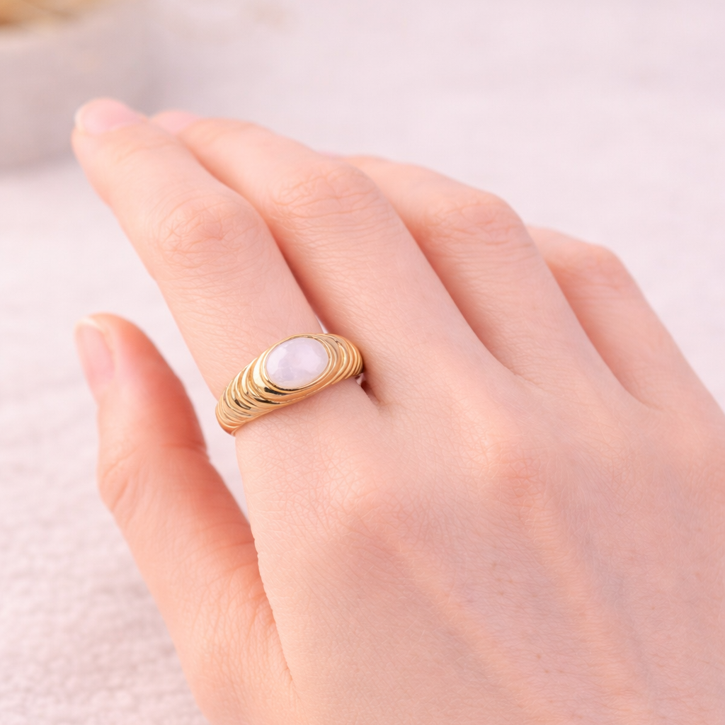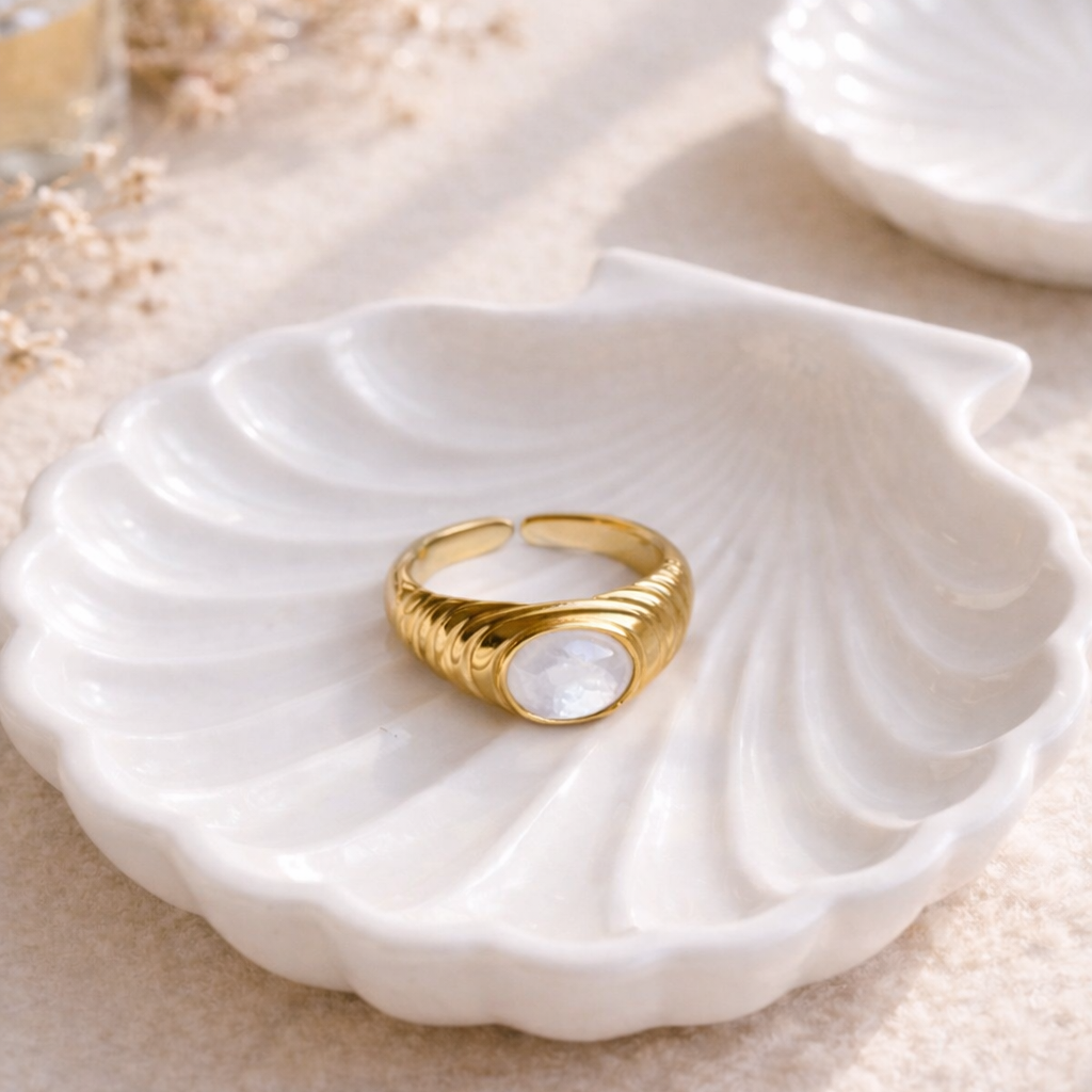 Zarif vintage formu ve modern dokunuşuyla öne çıkan bu ayarlanabilir çelik yüzük, altın kaplama yüzeyi ve sedef görünümlü taşıyla şıklığı tamamlar. Günlük kullanımda kararmaz yapısıyla uzun ömürlüdür. Ayarlanabilir formu sayesinde her parmağa uyum sağlar. Minimal ama dikkat çekici tasarımıyla hem tek başına hem kombinlenerek kullanılabilir. Premium koleksiyonun özel parçalarından biridir.
