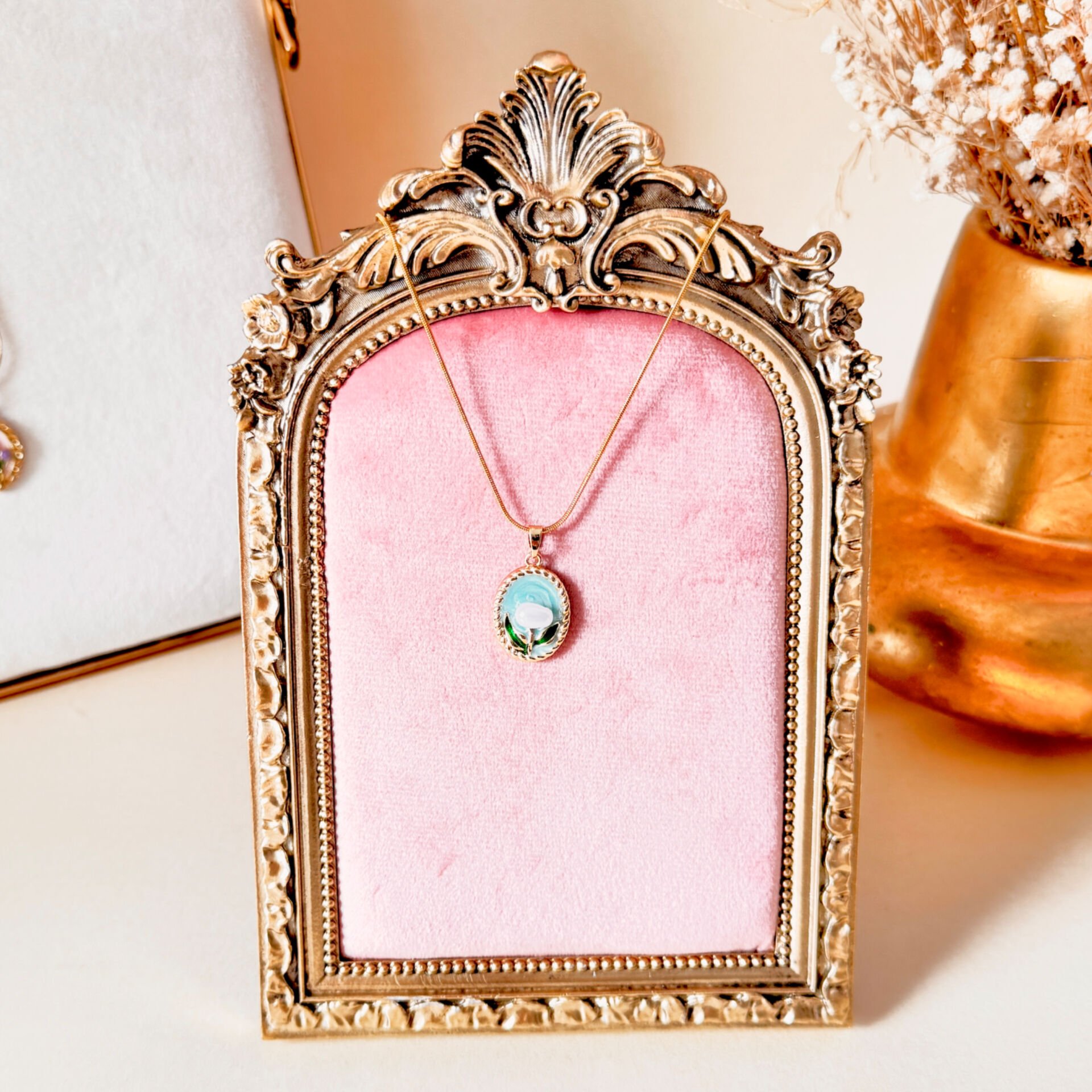 Vintage Çelik Kolye – Lale Figürlü İncili Oval Çelik Kolye
