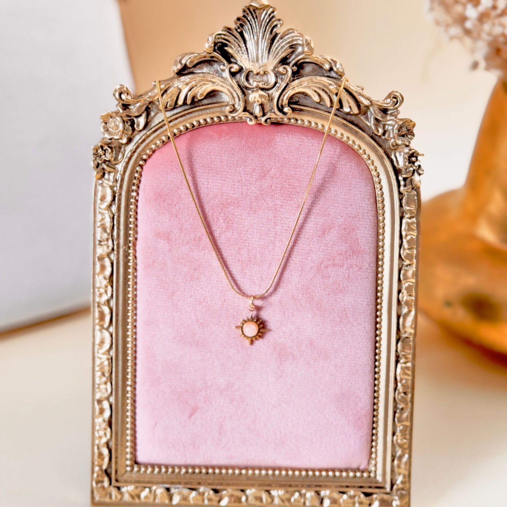 Vintage Çelik Kolye – Güneş Formlu Pembe Taşlı Çelik Kolye