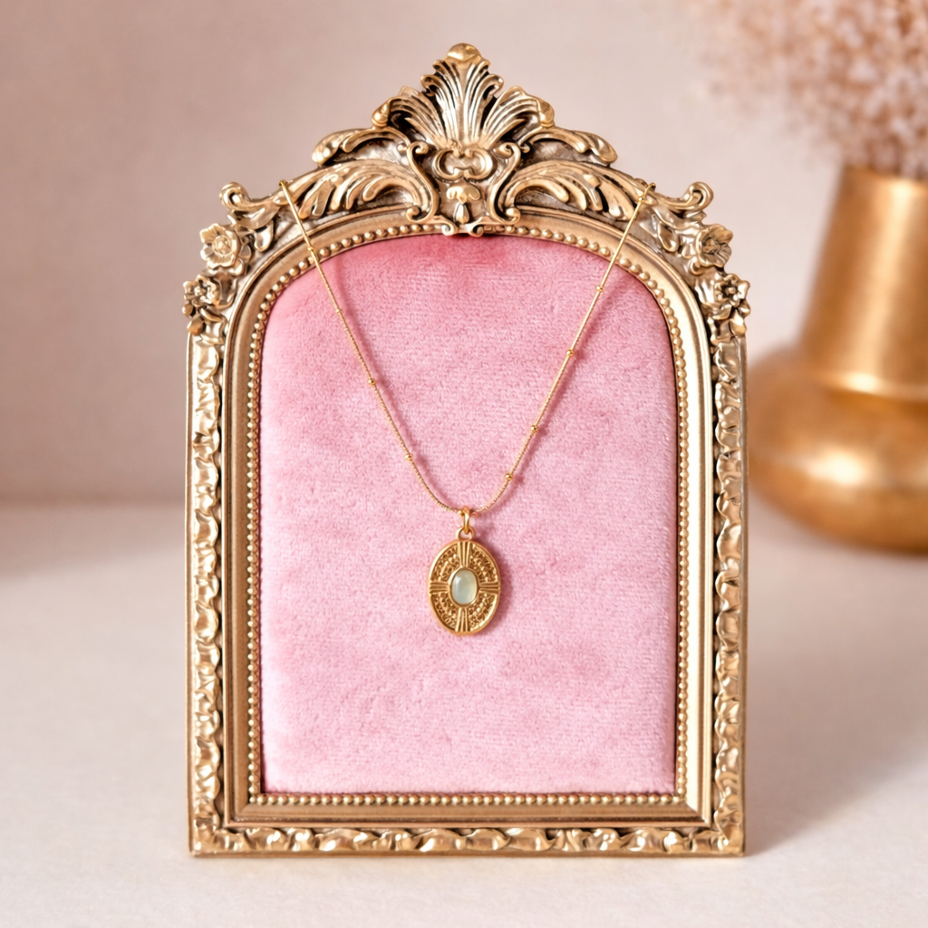 Vintage Çelik Kolye – Yeşil Taşlı Oval Çelik Kolye