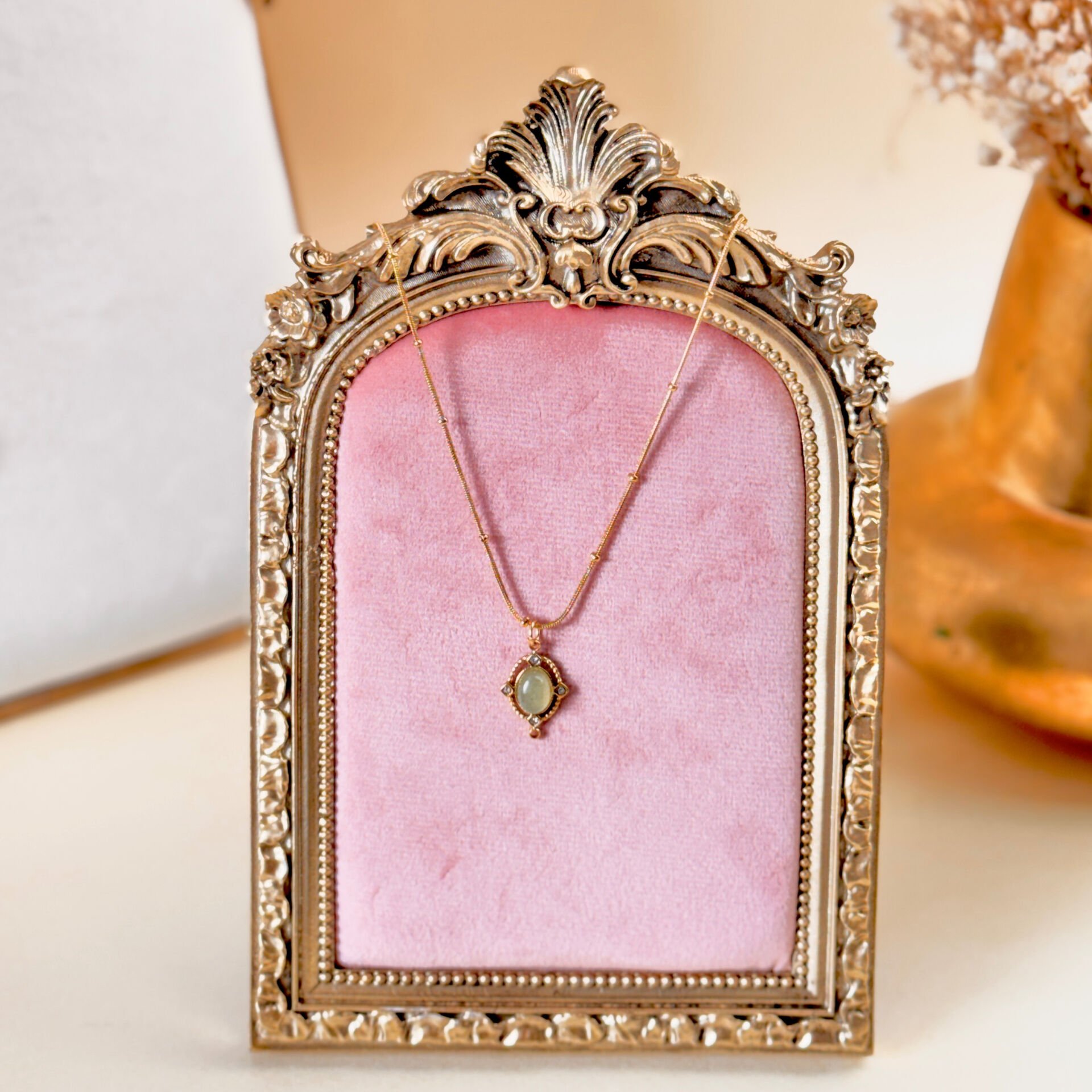 Vintage Çelik Kolye – Yeşil Taşlı Oval Çelik Kolye
