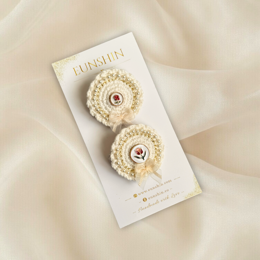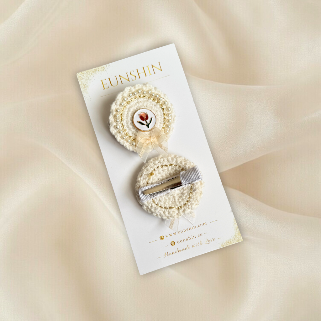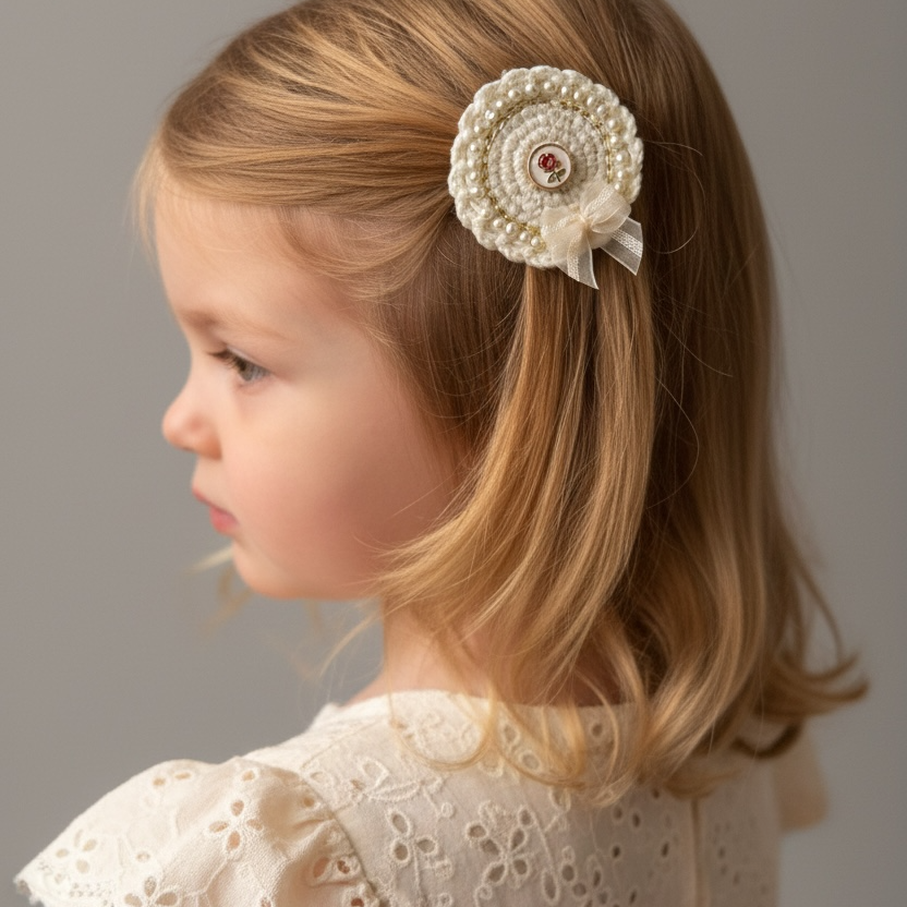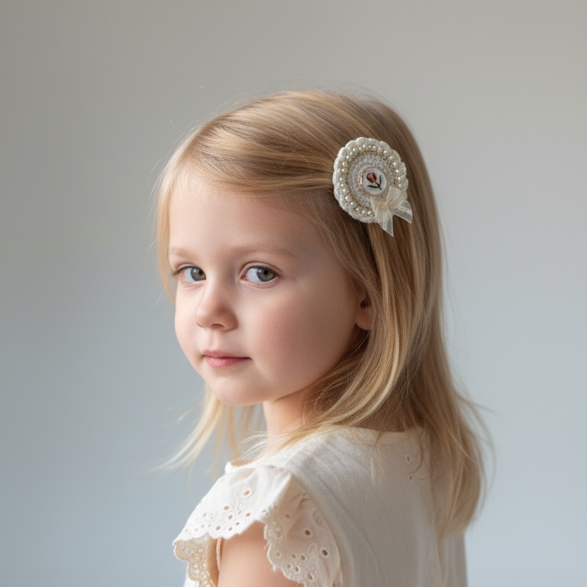 Vintage İnci İşlemeli Klips Toka – Lale & Gül Desenli Yuvarlak Zemin Fiyonk Detaylı Saç Tokası | Kız Çocuk & Kadın