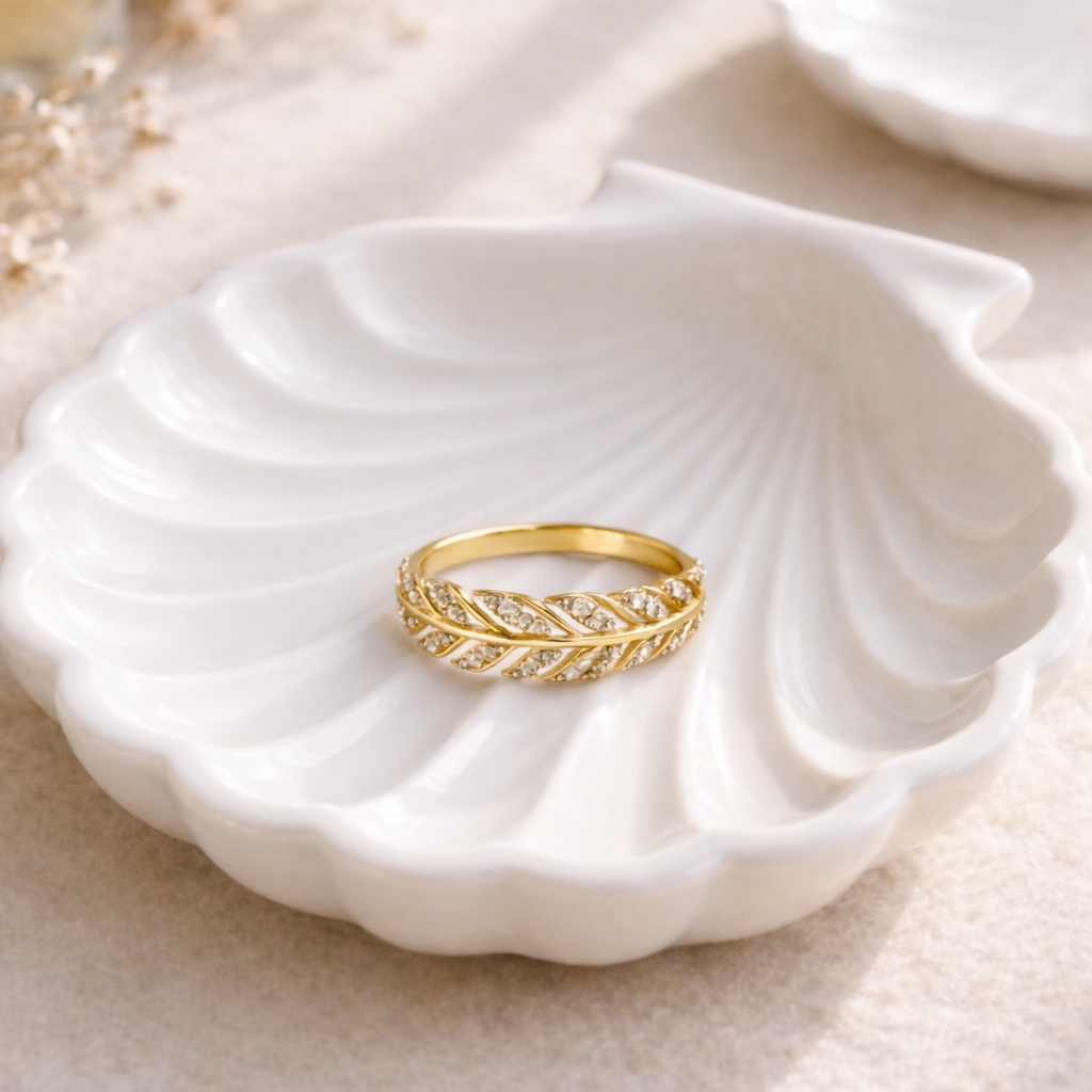 Doğadan ilham alan zarif yaprak formu ve ince zirkon taş detaylarıyla tasarlanan çelik yüzük, minimal şıklığı modern bir dokunuşla sunar. Paslanmaz çelik üzeri gold kaplama yapısı sayesinde uzun süre parlaklığını korur ve dayanıklı kullanım sağlar. İnce ve akıcı formu parmakta zarif bir duruş sunarken, ayarlanabilir yapısı farklı ölçülere kolayca uyum sağlar. Günlük kombinlerde sade bir şıklık, özel anlarda ise zarif bir tamamlayıcı olarak öne çıkan bu tasarım, EUNSHIN’in lüks ve modern çizgisini yansıtır.