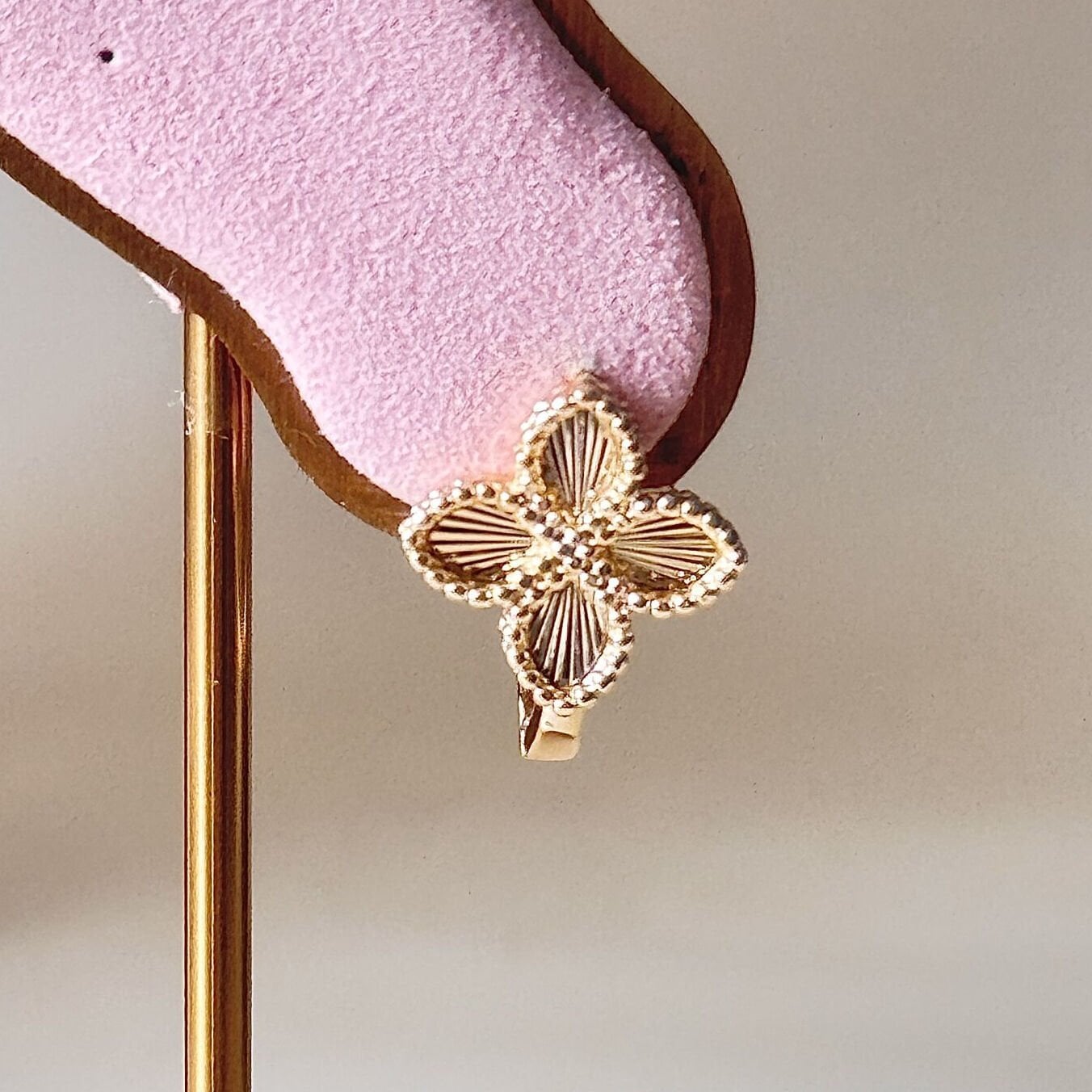 Zarif yonca formu ve zirkon taş detaylarıyla tasarlanan gold kaplama küpe, sade ama dikkat çekici bir şıklık sunar. Taşlı yüzeyi ışığı dengeli yansıtarak günlük kombinlere zarif bir ışıltı katar.
