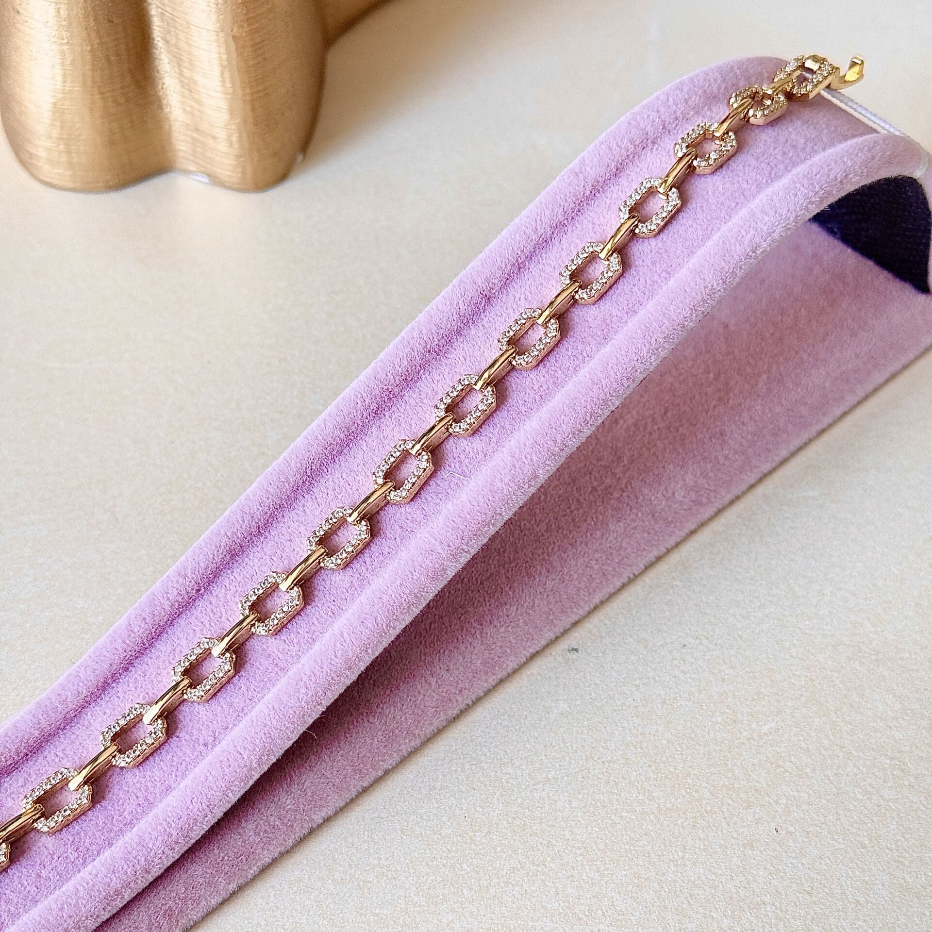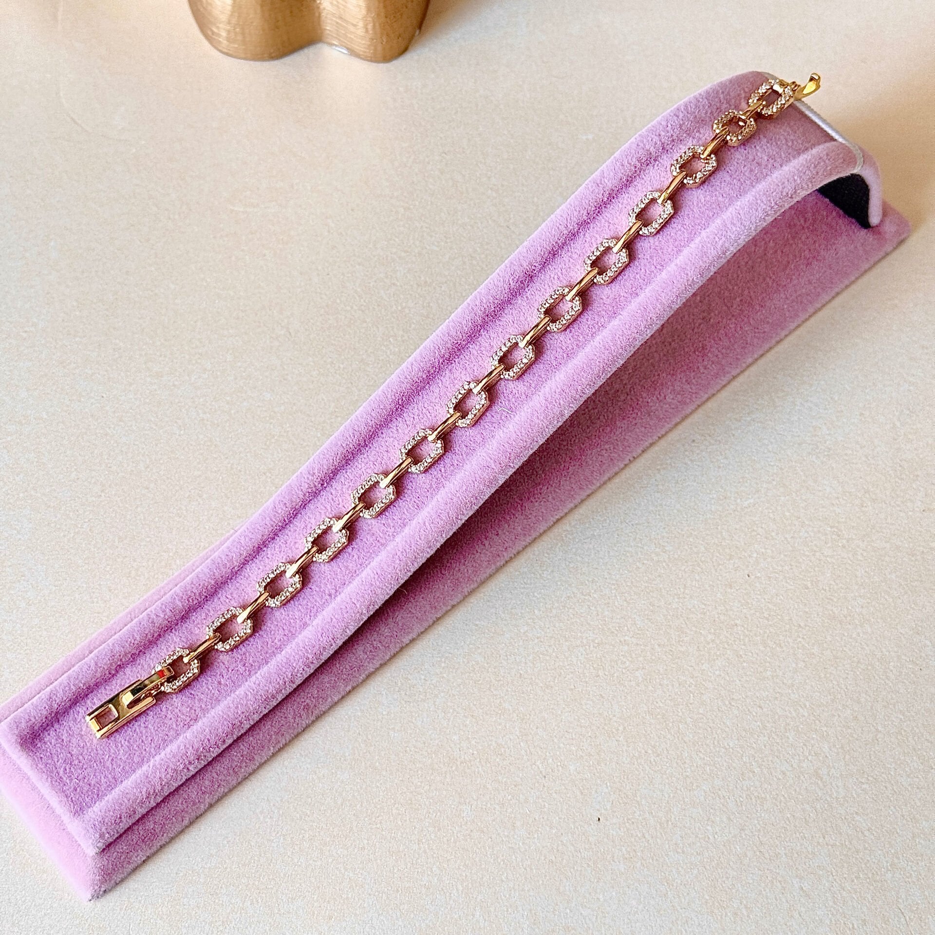 Gold zirkon detaylı zincir bileklik, parlak taş geçişli halka formu ile bilekte güçlü ve dikkat çekici bir görünüm sunar Klasik zincir modellere göre daha dolgun ve premium bir duruş sağlar