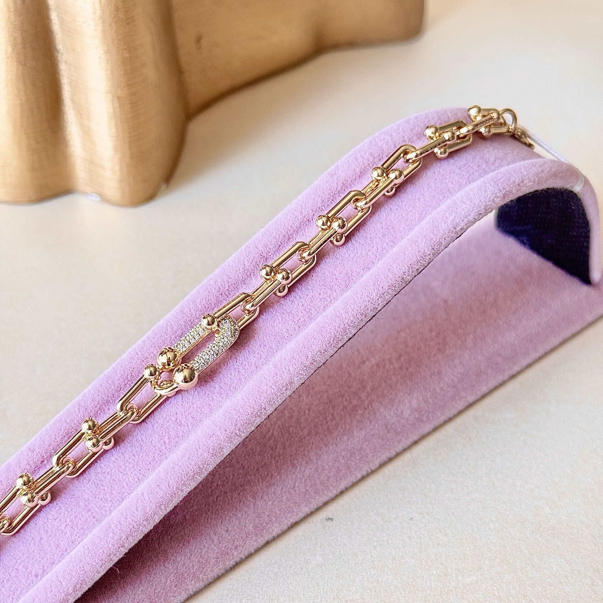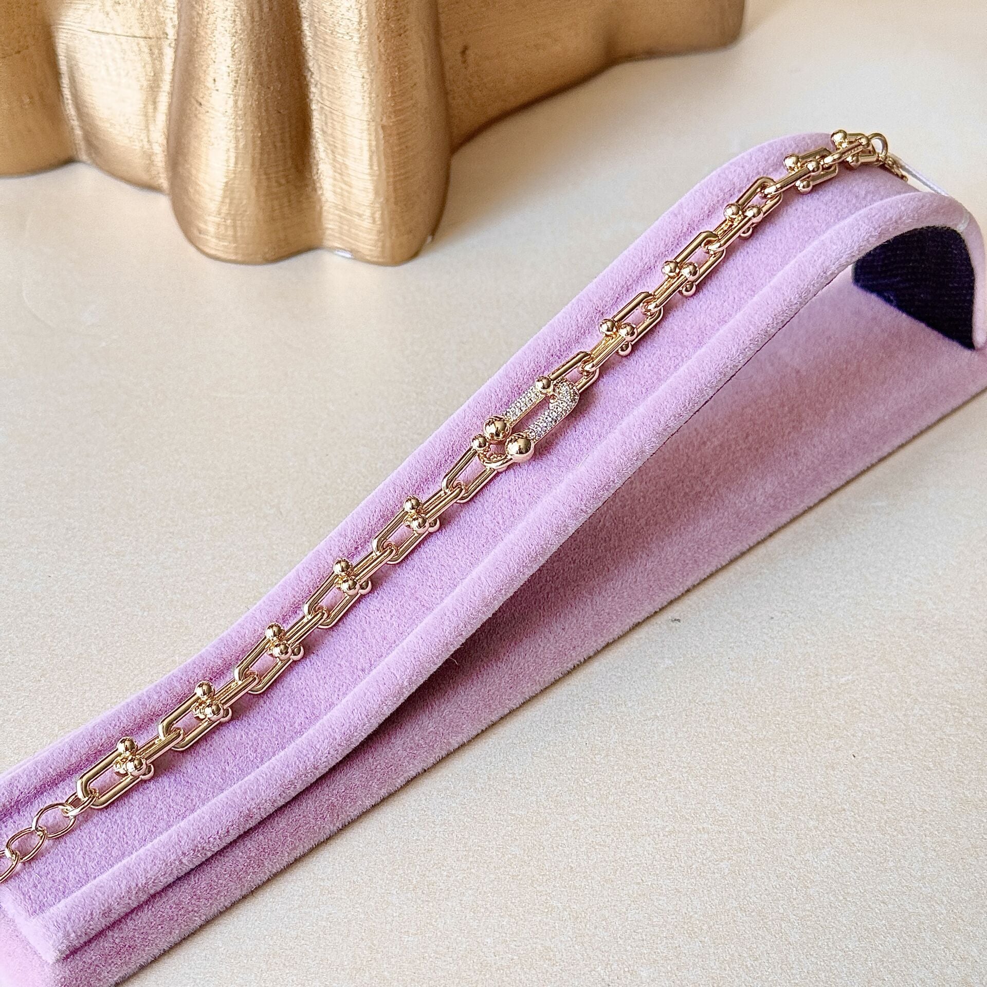 Zarif zincir gold bileklik, modern halka formu ve top detaylarıyla bilekte güçlü ama dengeli bir görünüm sunar Ortadaki zirkon detaylı parça ürüne ışıltı katar ve tasarımı daha dikkat çekici hale getirir