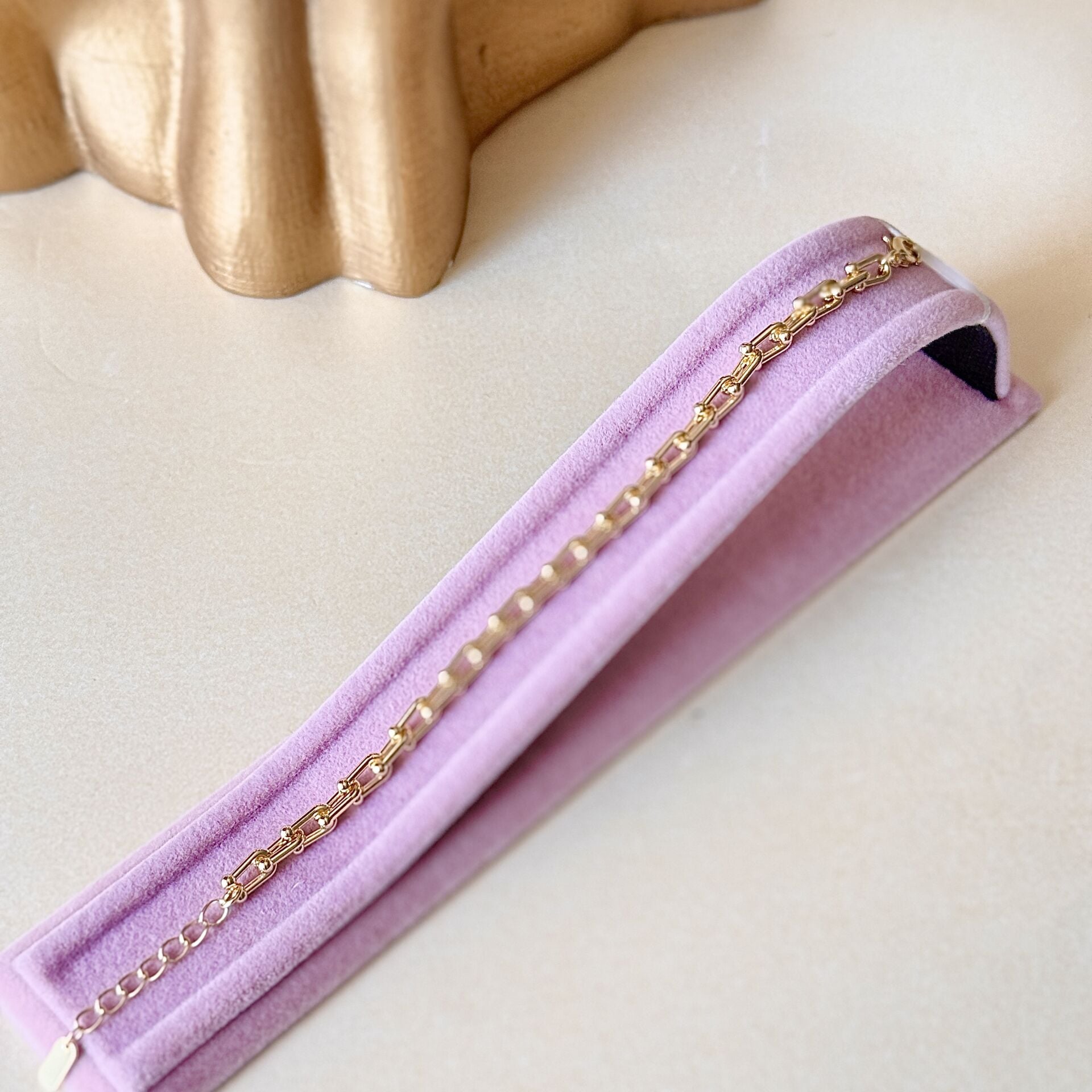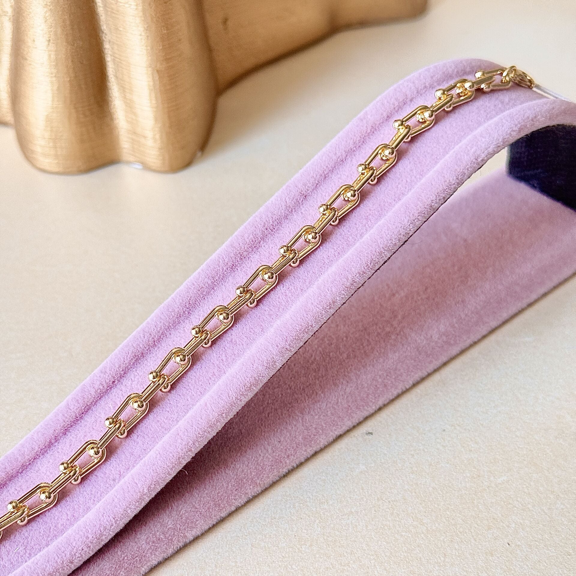 Zarif zincir gold bileklik, modern halka yapısı ve aralara yerleştirilen top detaylarıyla sade ama karakterli bir stil sunar Abartısız şıklık isteyenler için günlük kullanımda rahatlıkla tercih edilir