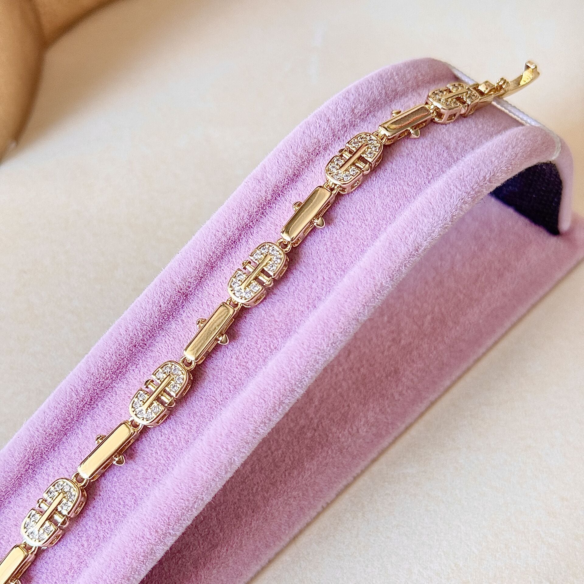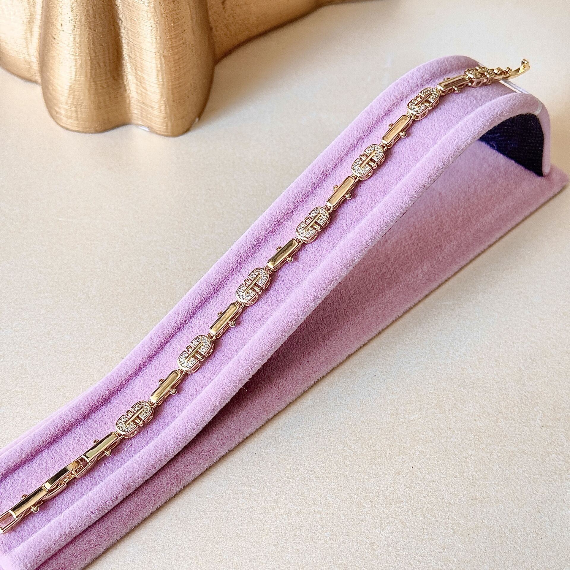 Zirkon detaylı gold bileklik, özel formda tasarlanmış zincir yapısı ve taşlı geçiş detayları ile dikkat çekici ve dengeli bir stil sunar Klasik zincir modellerden farklı olarak daha dolu ve premium bir duruş sağlar