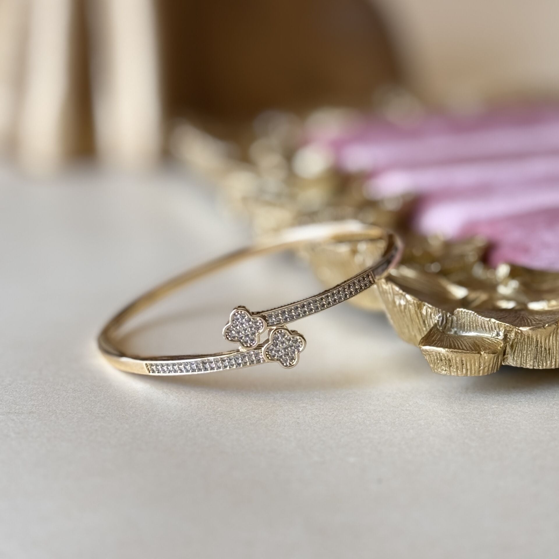 Gold kaplama kelepçe bileklik, çift yonca form detayı ve ince taş işçiliği ile dengeli bir ışıltı sunar. İnce kelepçe yapısı bilekte hafif ve zarif bir duruş sağlar.