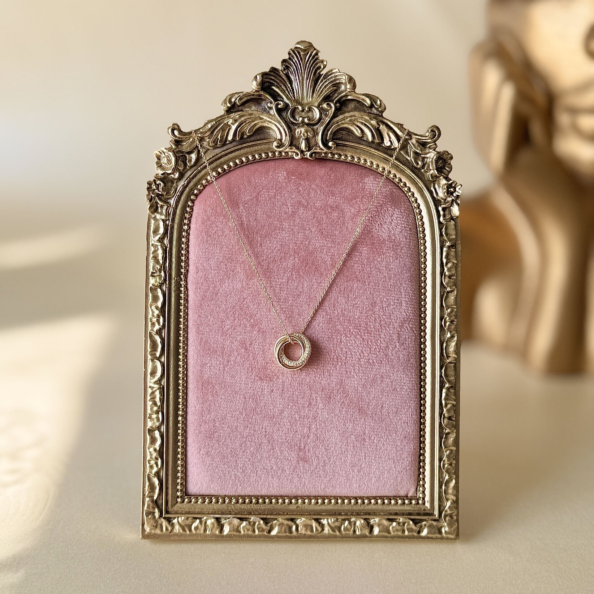Minimal halka formu ve zarif zirkon taş detaylarıyla tasarlanan gold kaplama kolye, sade ama dikkat çeken bir şıklık sunar. Işığı dengeli yansıtan taş dizilimi sayesinde hem günlük kullanımda hem özel kombinlerde rahatlıkla tercih edilebilir.