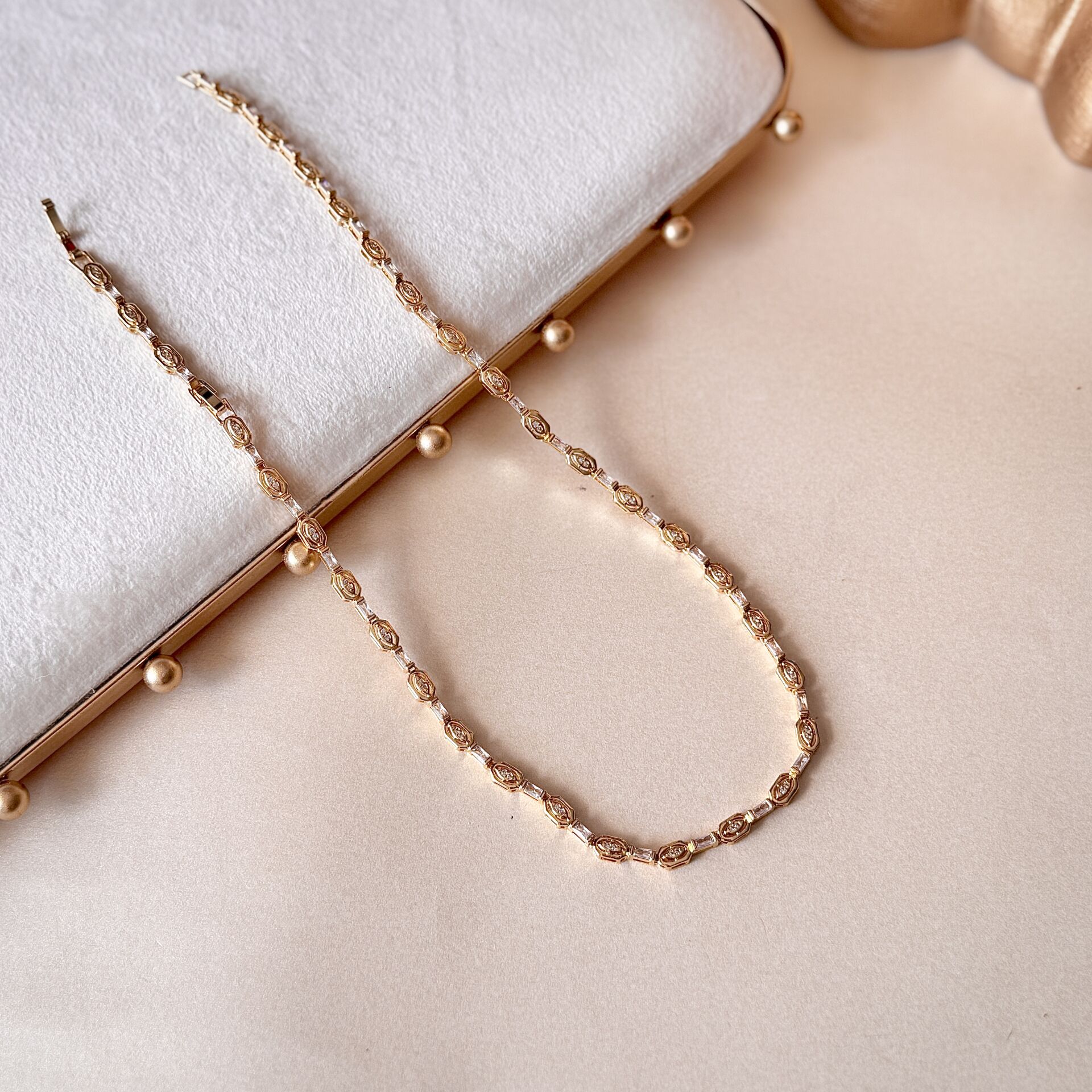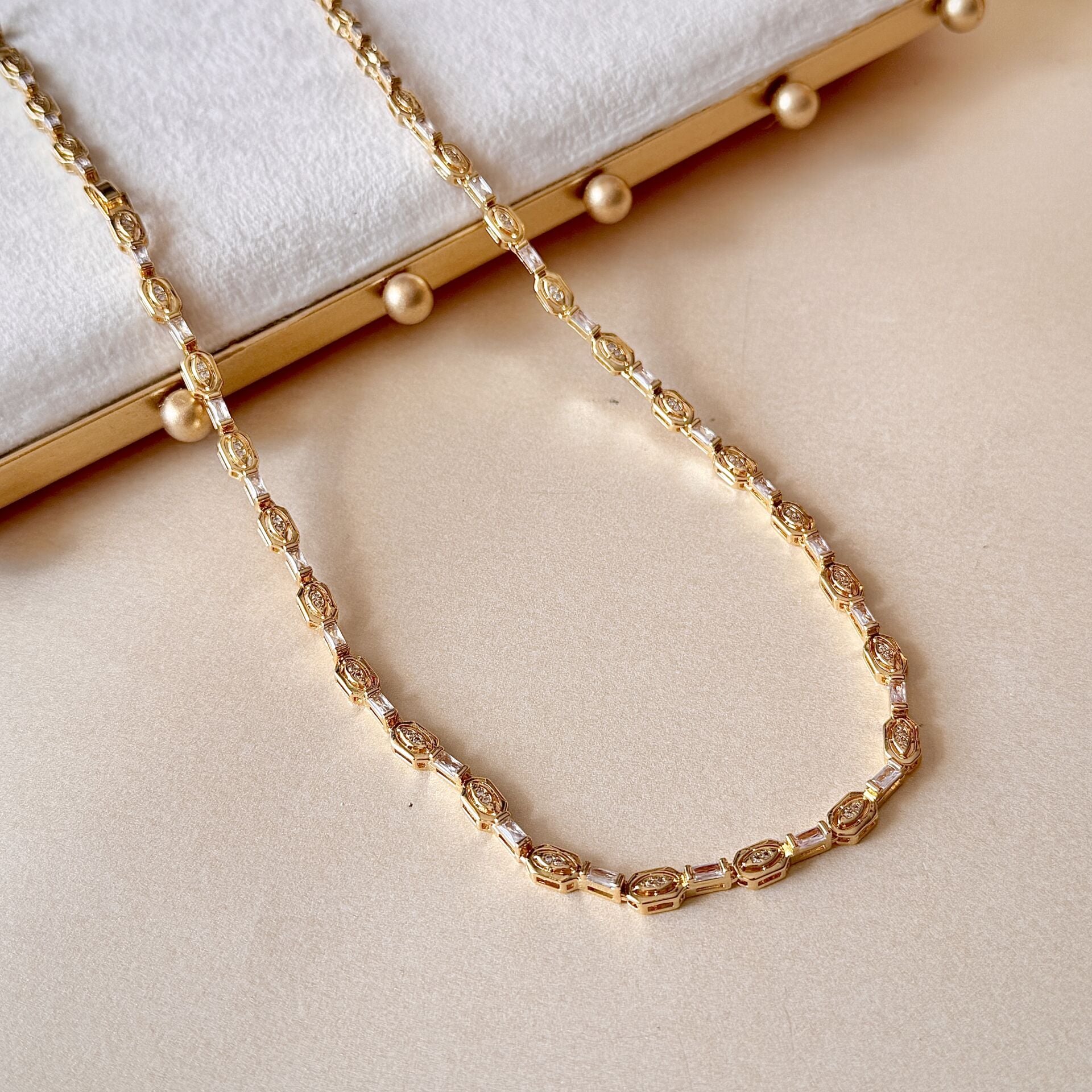 Özel kesim zirkon taş detayları ve segmentli formu ile tasarlanmış bu kolye, klasik zincir modellerden daha güçlü ve dikkat çekici bir görünüm sunar. Işığı farklı açılarda yansıtan taş yapısı sayesinde tek başına bile etkili bir duruş sağlar.
