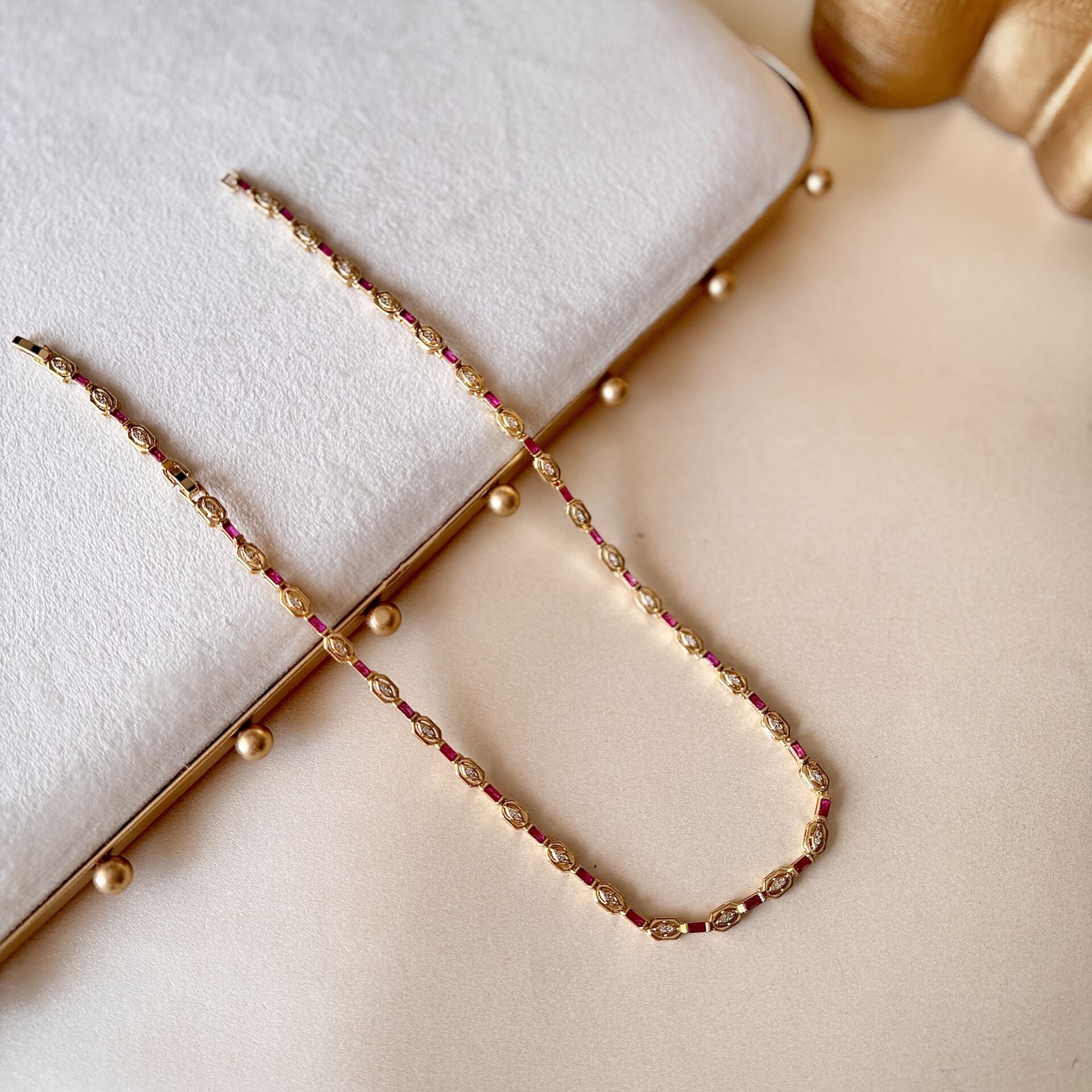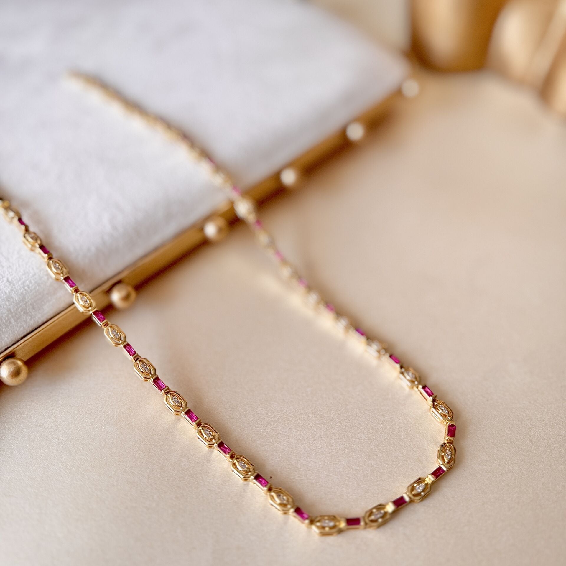 Zirkon taş detayları ve fuşya renk geçişleriyle tasarlanmış bu kolye, klasik gold modellerden ayrılan daha karakterli bir görünüm sunar. Segmentli yapısı sayesinde boyunda düzgün durur ve ışığı farklı açılarda yansıtarak dikkat çeker.