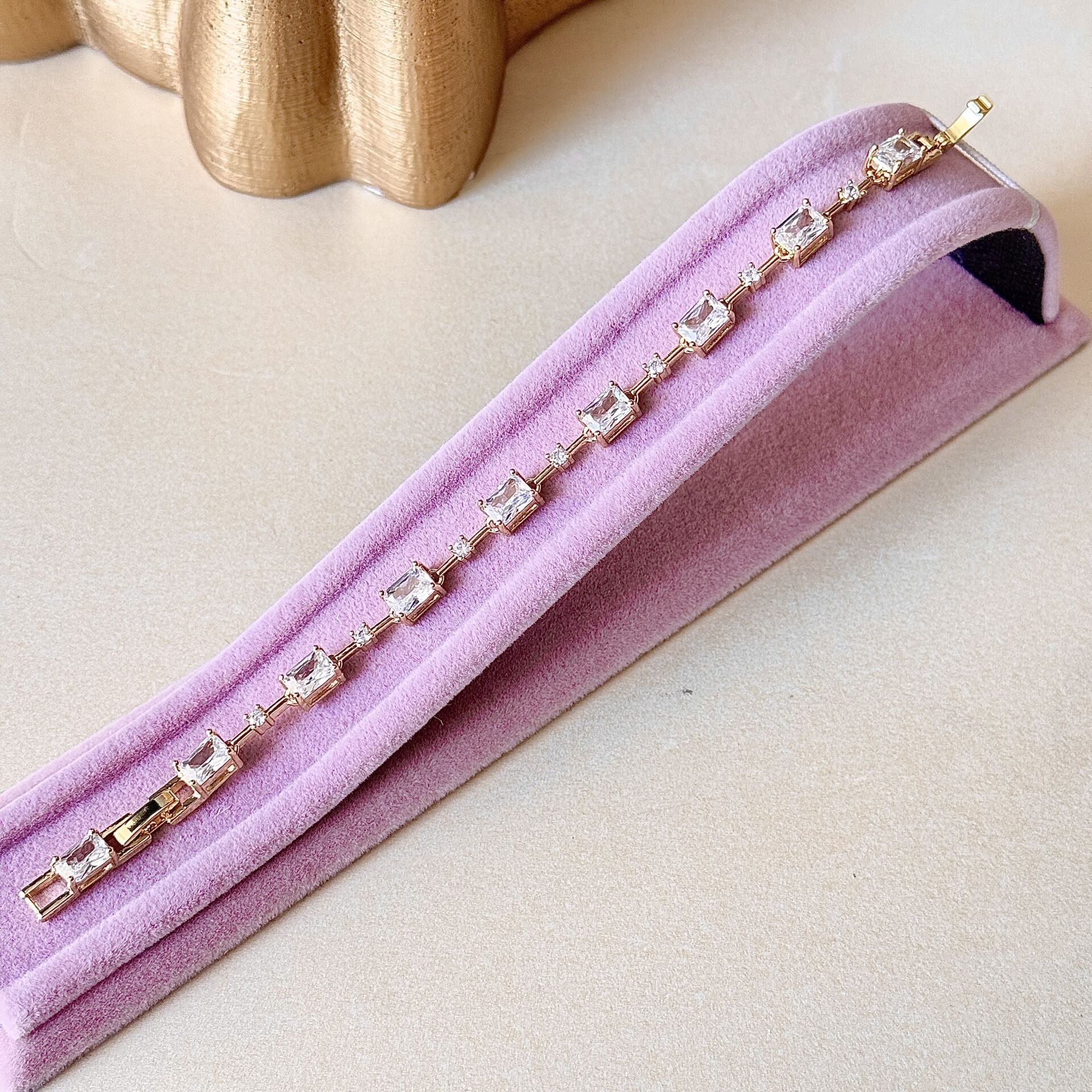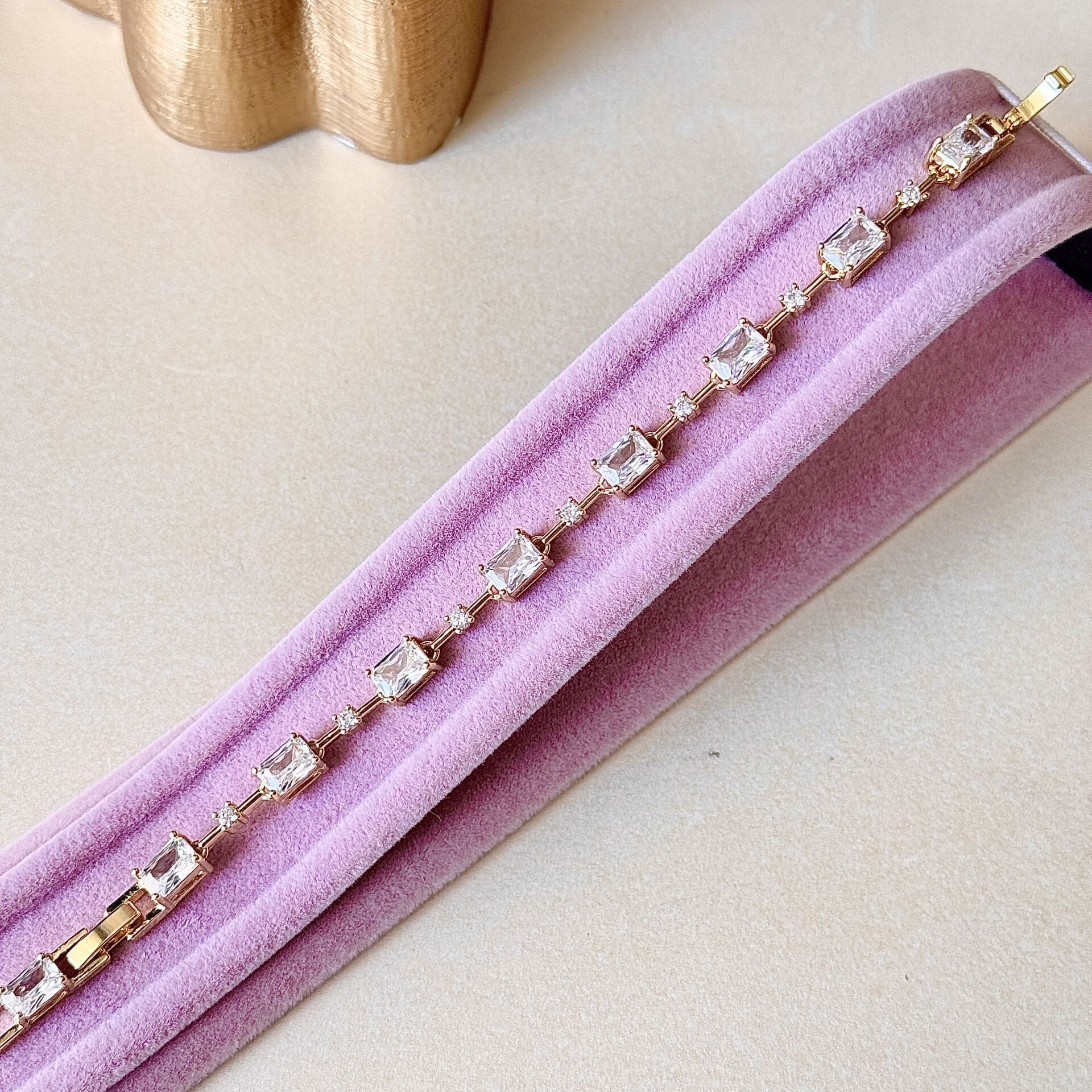 Zirkon taşlı gold bileklik, dikdörtgen kesim taş formu ve aralara yerleştirilen minimal detaylarla dengeli ve dikkat çekici bir tasarım sunar Taşların ışığı yansıtma formu sayesinde bilekte net bir ışıltı oluşturur